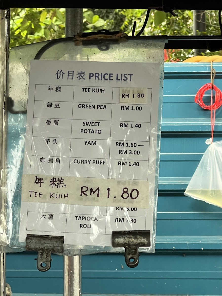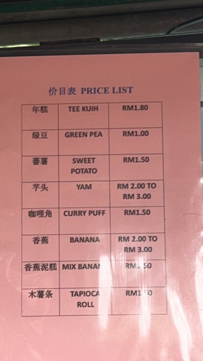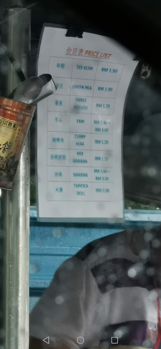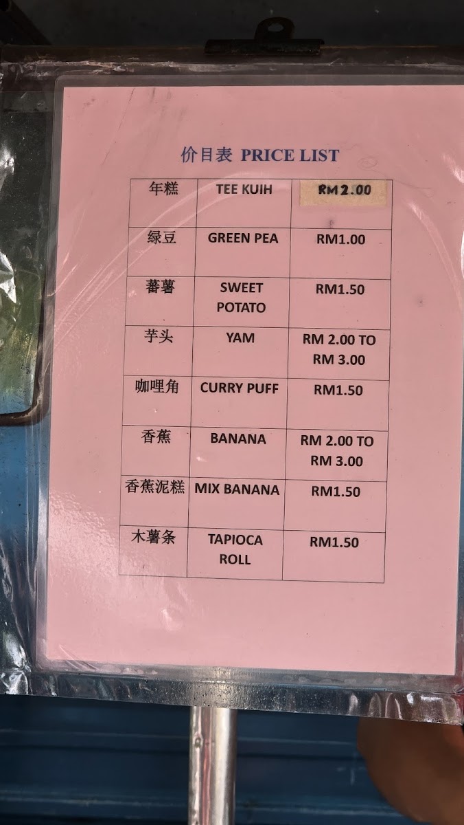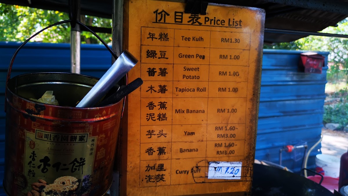 The menu boasts an array of treats including tee kuih, sweet potato, yam, and curry puff, each priced reasonably between RM 1.00 to RM 3.00. Customers often highlight the addictive nature of the fried nian gao, complemented by yam. However, it’s worth noting that the goreng pisang can be elusive due to sourcing challenges.